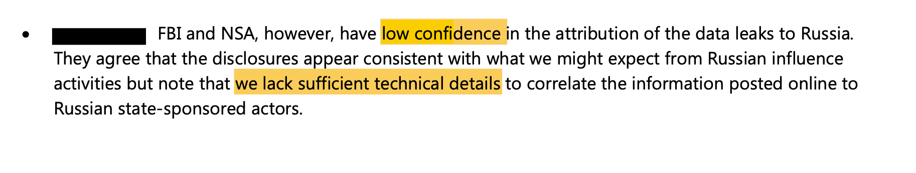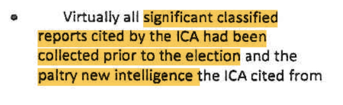 A recently declassified House Intelligence (HPSCI) report confirms that there was no new intelligence collected in the ensuing weeks sufficient to change the NSA and FBI’s initial low confidence assessment. “Virtually all significant classified reports cited by the ICA,” the HPSCI report found, were “collected prior to the election.” And the only “new intelligence” cited by the ICA was “paltry.”