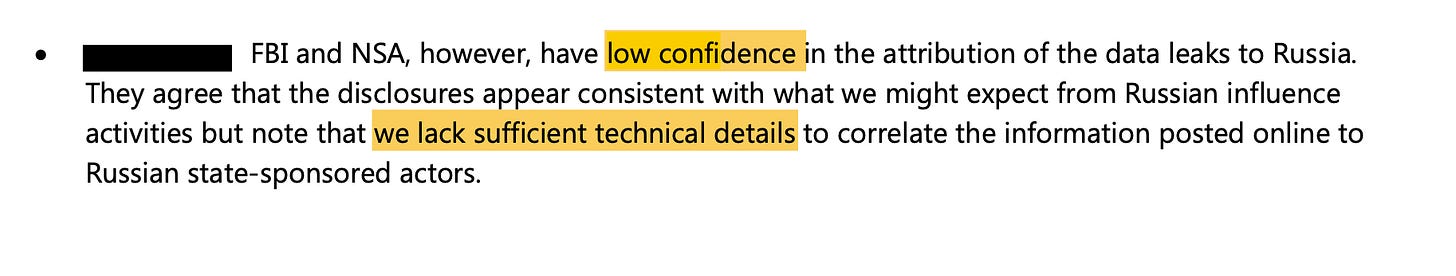 It also newly answers a question that I raised in my July 2019 report on the flaws in Mueller’s “Russian interference” allegations: did the allegation of a Russian hack and leak operation rely on evidence from the National Security Agency? As I wrote, invoking former NSA Technical Director Bill Binney, with its sweeping surveillance powers over the global internet, the NSA is “the only U.S. agency that could conclusively determine the source of the alleged DNC email hacks.” Now we know conclusively that the intelligence used to implicate Russia did not come from the NSA – and that the NSA was prevented from assessing its validity.