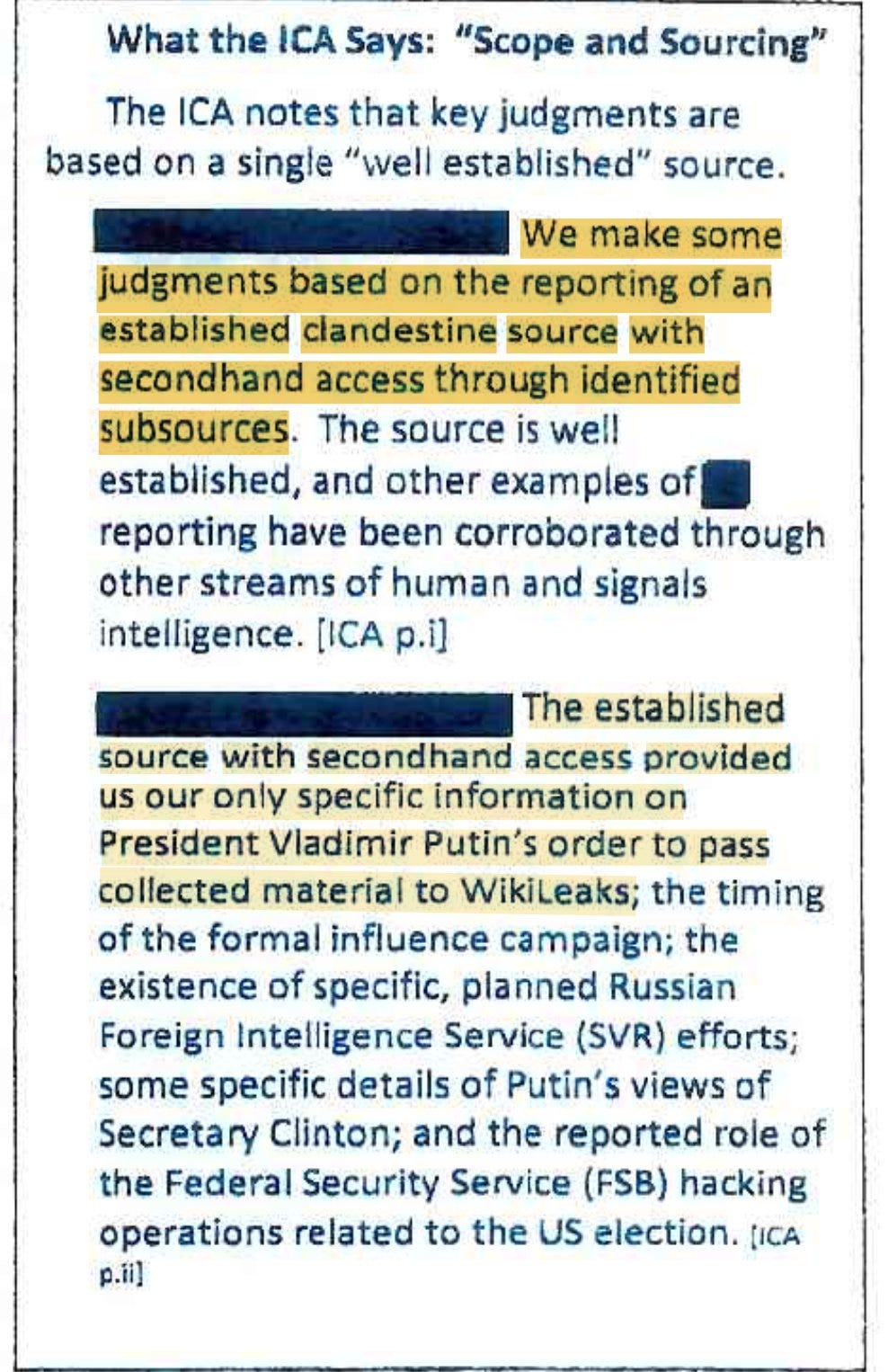 As for the ICA’s allegation that Putin ordered that stolen Democratic Party material be passed on to Wikileaks, a more classified version of the report noted that the “only specific information” came from an “established source with second hand access.” In other words, another one of Russiagate's foundational allegations was based on “second hand” hearsay. (Julian Assange, the Wikileaks founder, has long denied that Russia was his source. None of the US intelligence, Justice Department and Congressional investigations of the Trump-Russia affair bothered to interview him).