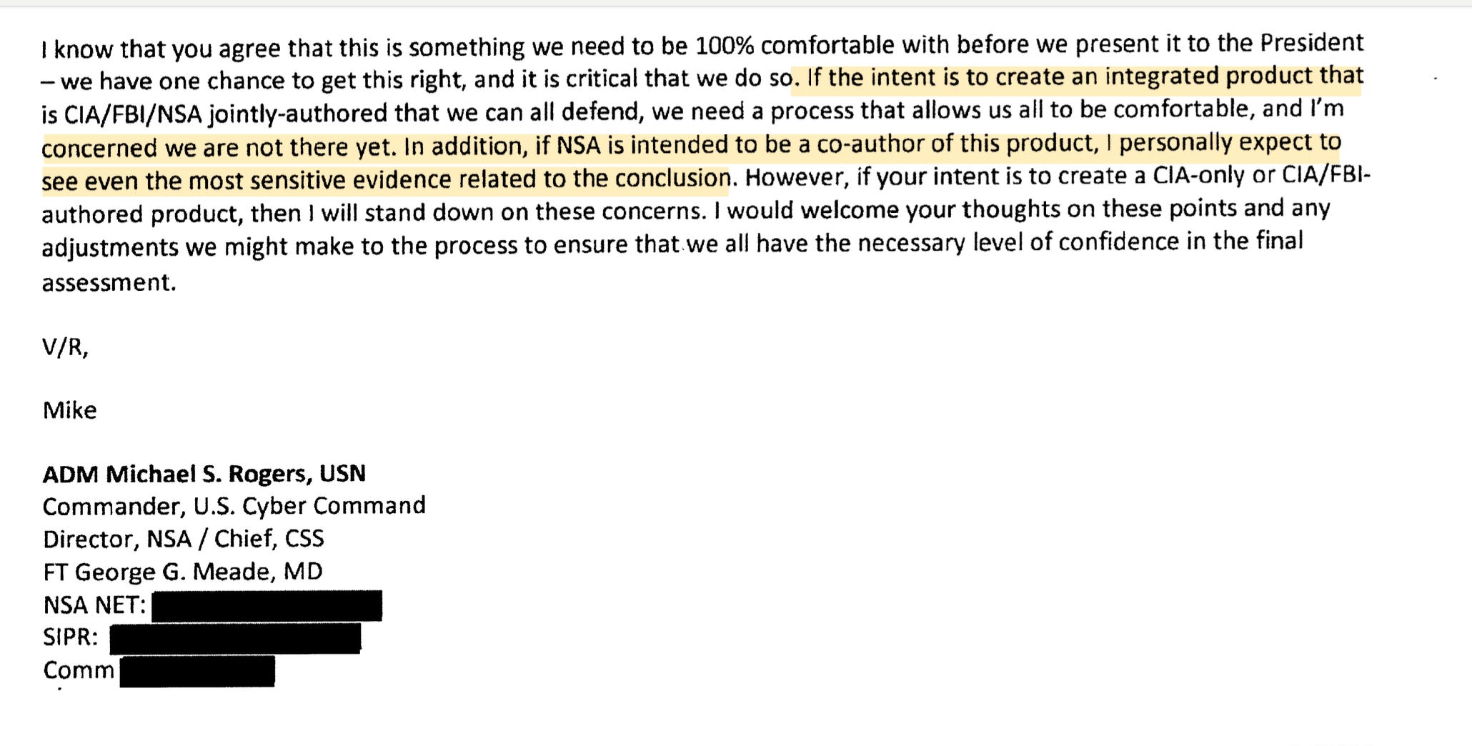 Perhaps to soften the implication that his colleagues at the highest levels of US intelligence were acting deceptively, Rogers added a caveat: “To be clear, I am not saying that we disagree substantively.” But he also made clear that, because the NSA was being marginalized, he was not ready to agree with them publicly: “I do want to make sure that, when we are asked in the future whether we can absolutely stand behind the paper, that we don't have any reason to hesitate because of the process... If the intent is to create an integrated product that is CIA/FBI/NSA jointly-authored that we can all defend, we need a process that allows us all to be comfortable, and I’m concerned we are not there yet.”