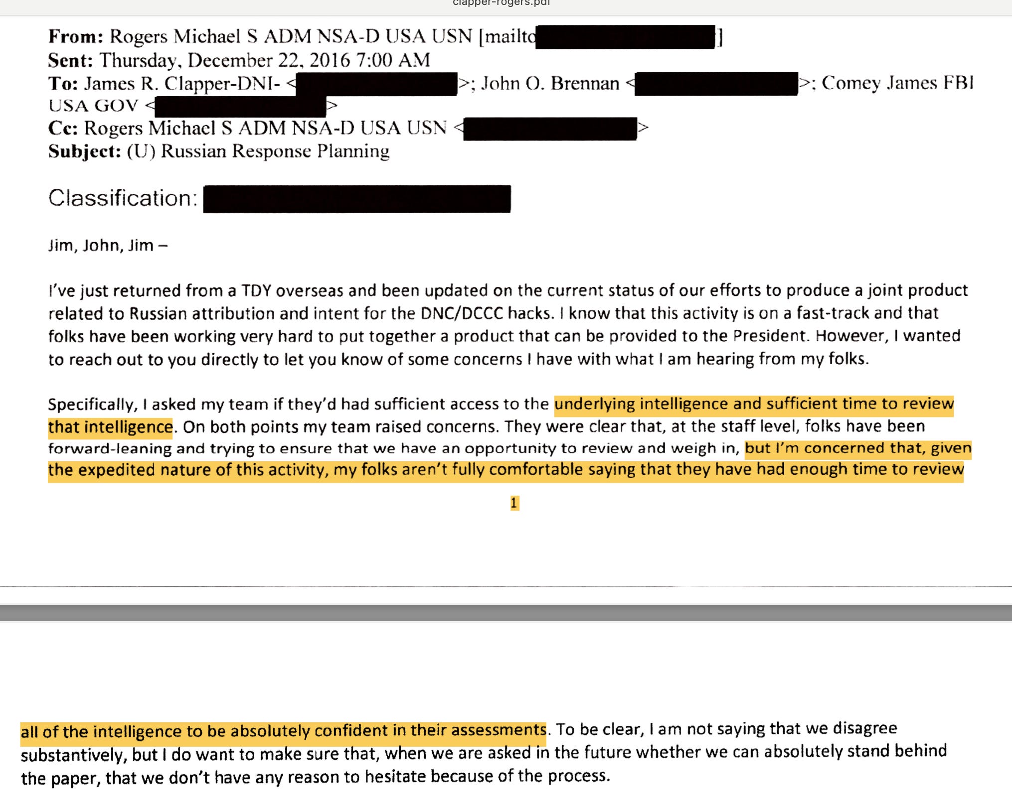 When it comes to the issue of “Russian attribution and intent for the DNC/DCCC hacks,” Rogers wrote on December 22nd, his team had “concerns” that they were not given “sufficient access to the underlying intelligence and sufficient time to review that intelligence.” Accordingly, NSA officials “aren't fully comfortable saying that they have had enough time to review all of the intelligence to be absolutely confident in their assessments.”