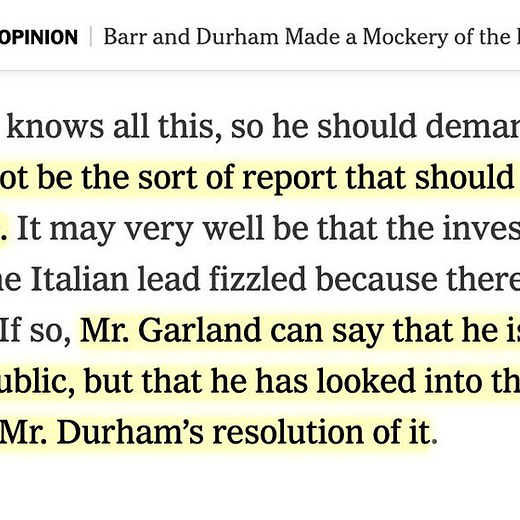 Durham has publicly dissented from Horowitz’s findings on the matter of “predication and how the FBI case was opened,” and noted that his "investigation is not limited to developing information from within component parts of the Justice Department." Rather than wait for Durham to deliver his findings, the Times is instead echoing the narratives of intelligence officials who assure us that they acted by the book.
